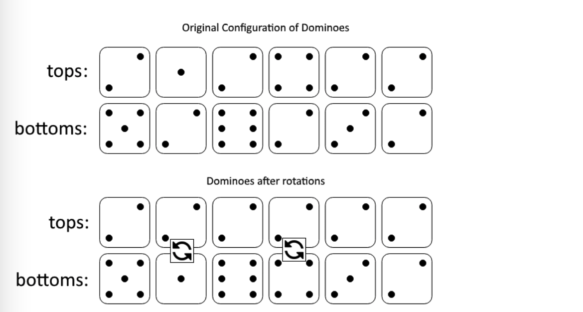 In a row of dominoes, tops[i] and bottoms[i] represent the top and bottom halves of the ith domino. (A domino is a tile with two numbers from 1 to 6 - one on each half of the tile.)